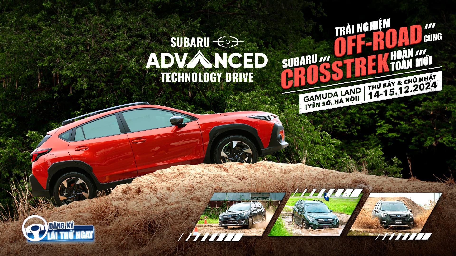 Thứ 7 & Chủ nhật (14-15.12.2024), Subaru Việt Nam sẽ tổ chức sự kiện Trải Nghiệm & Chinh Phục chất OFF-ROAD đích thực - Subaru SATD 2024 với Subaru Crosstrek hoàn toàn mới, mang đến cho tất cả khách hàng cơ hội lái thử và trải nghiệm địa hình Off-Road thực tế với những bài thử hấp dẫn: